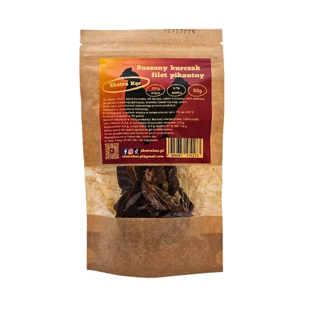 Skład jest uczciwy i prosty: filet z piersi kurczaka, sól morska, cukier trzcinowy, ocet jabłkowy, przyprawy (w tym gorczyca), aromaty (zawierają soję i seler). Jak zawsze — biały nalot to naturalny efekt suszenia.